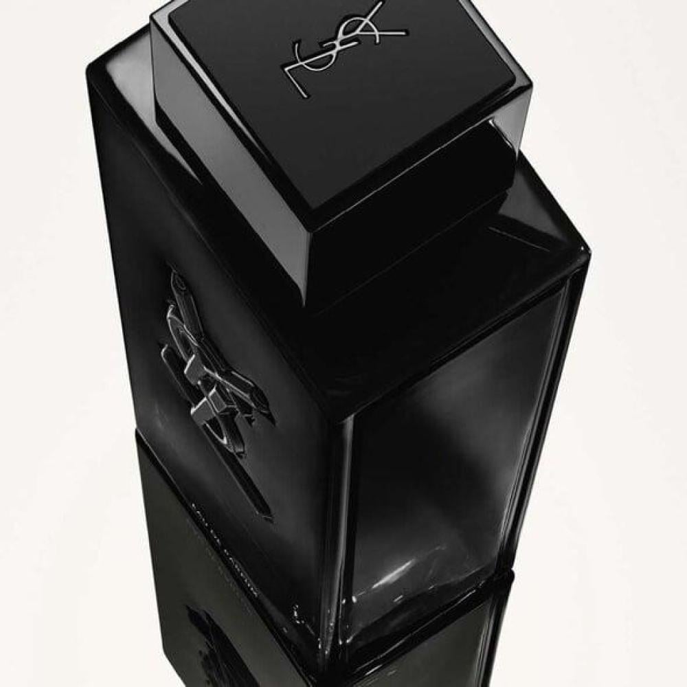 تصميم متطرف من YSL في زجاجة. زجاجة سوداء غير لامعة جريئة تتناقض مع شعار YSL Cassandre الأسود اللامع المضمن داخل الزجاجة.